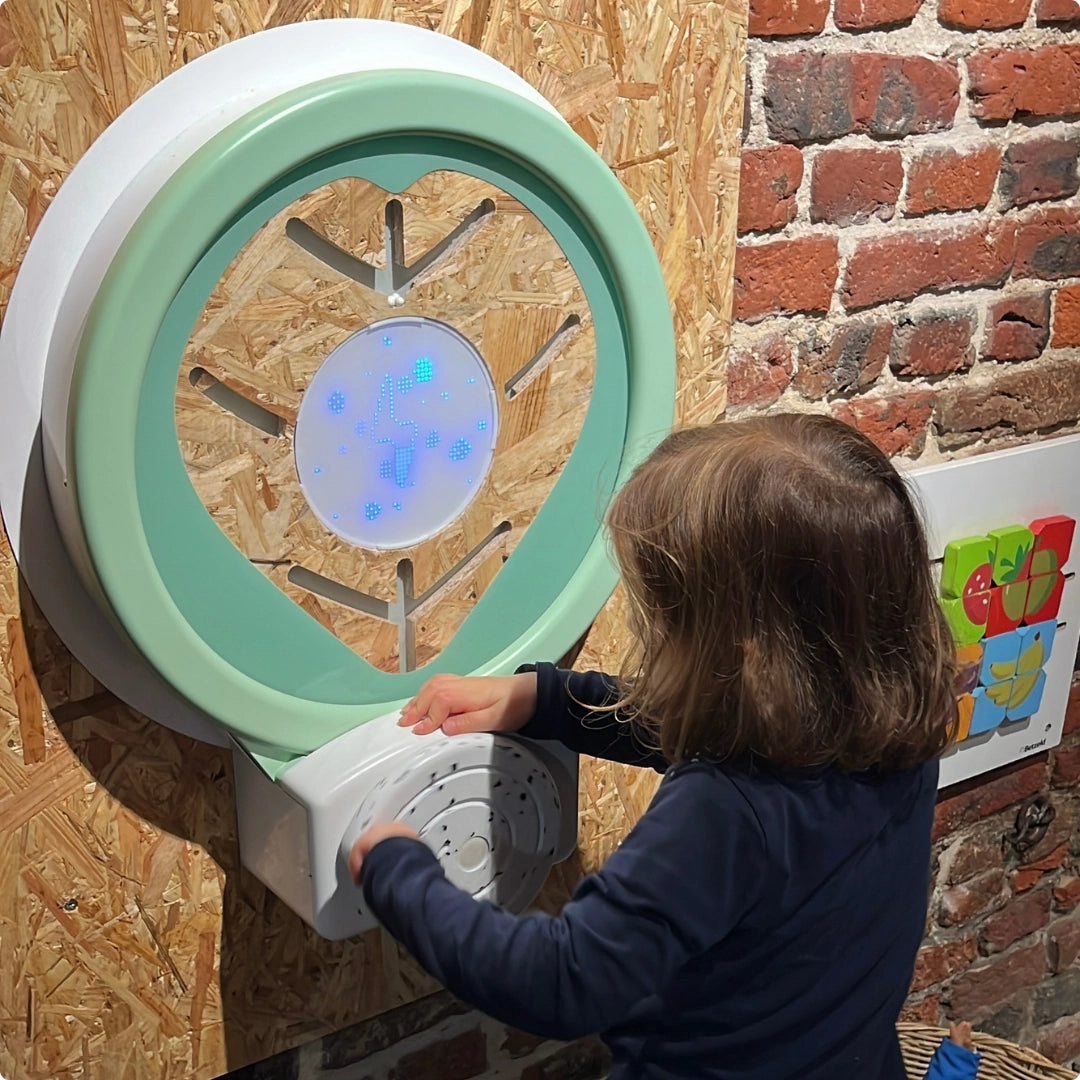 En tournant la manivelle, l’enfant fait descendre les billes le long du circuit intégré au panneau, créant un effet visuel naturel et fluide qui évoque la circulation de la sève à l’intérieur d’une feuille.