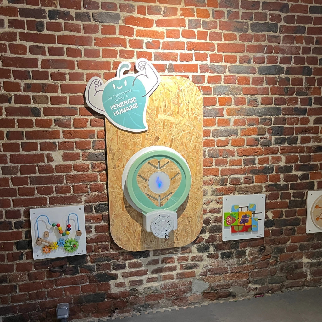 La collection Kylii Power© by Kylii Kids est composée 4 panneaux de jeux interactifs RSE pour apprendre en jouant. L’écran LED s’allume sans câbles et sans batterie, juste grâce à l’énergie des enfants qui tournent la manivelle.