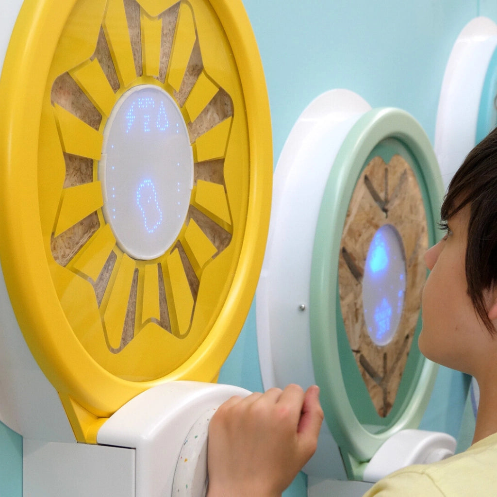 Kylii Power est un jeu mural interactif unique, conçu pour fonctionner sans câble ni batterie. En tournant la manivelle, l’enfant alimente un écran LED intégré et déclenche un mini jeu.