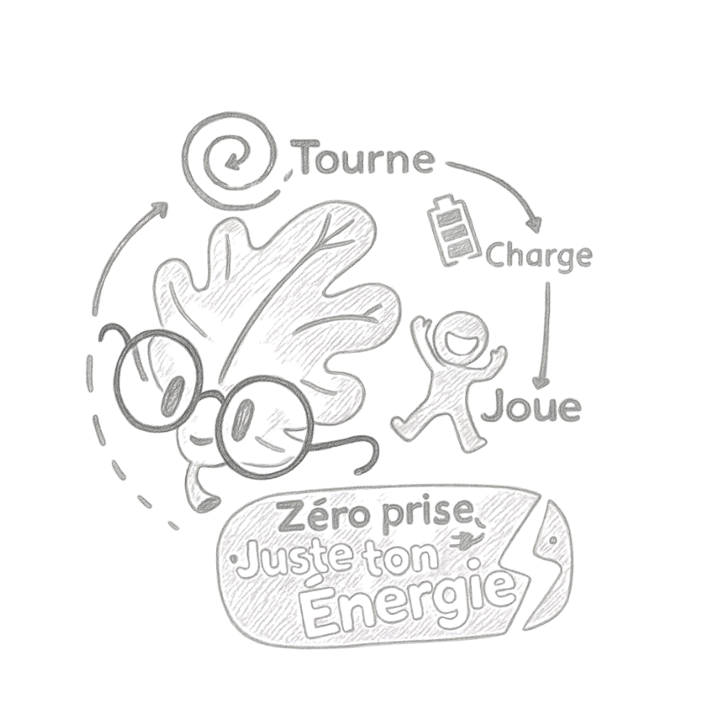Fonctionne sans électricité, sans pile, sans batterie, sans câble. L’enfant génère l’énergie de l’écran LED et du jeu en tournant la manivelle.